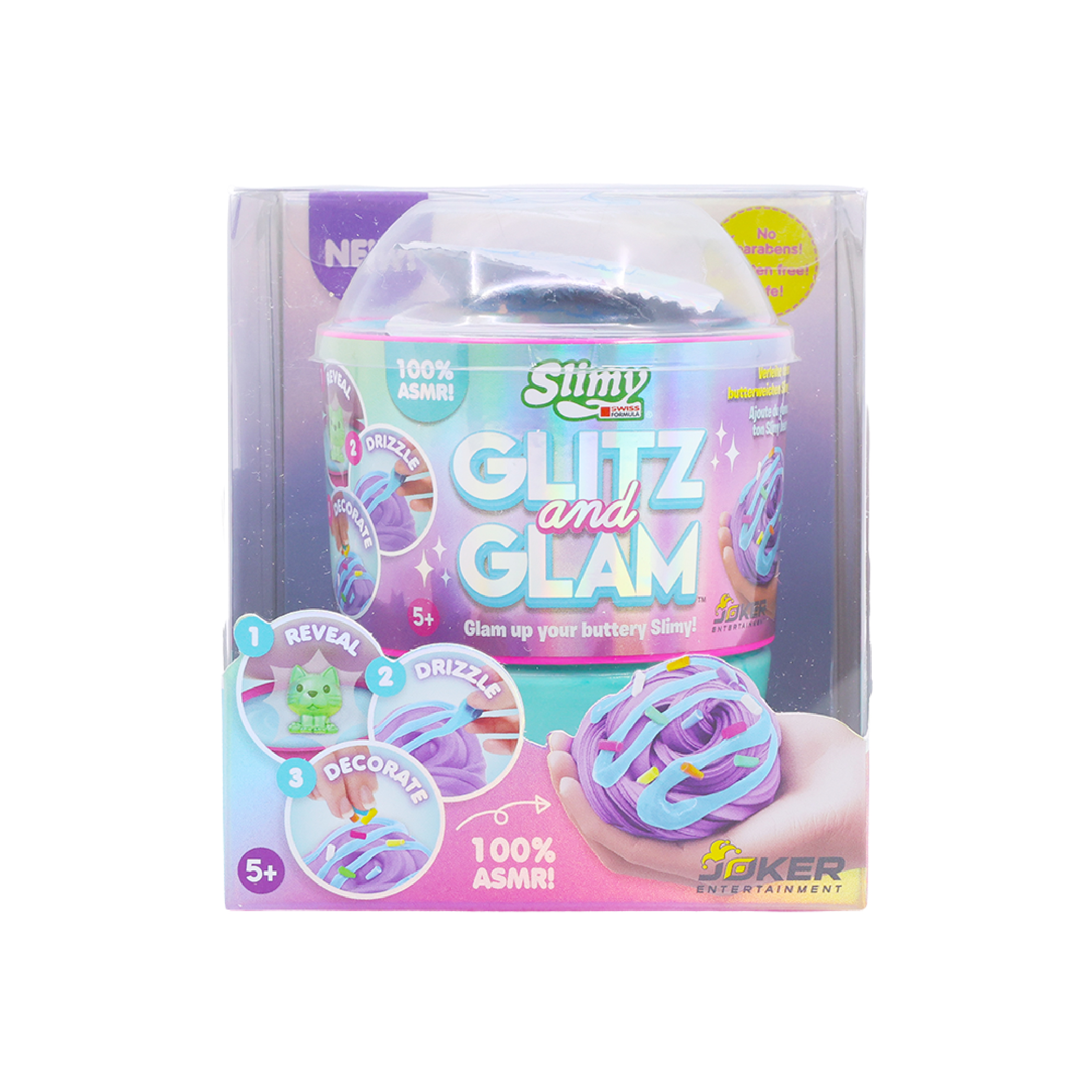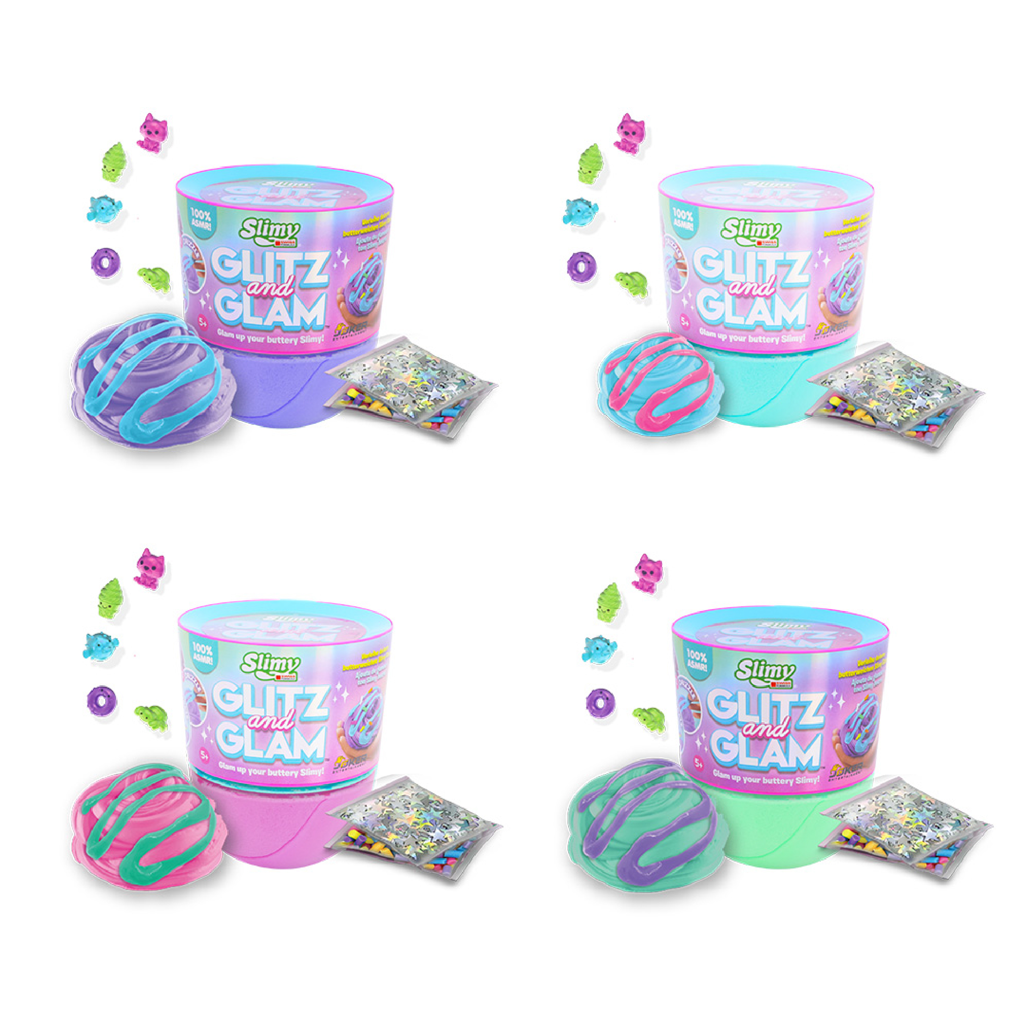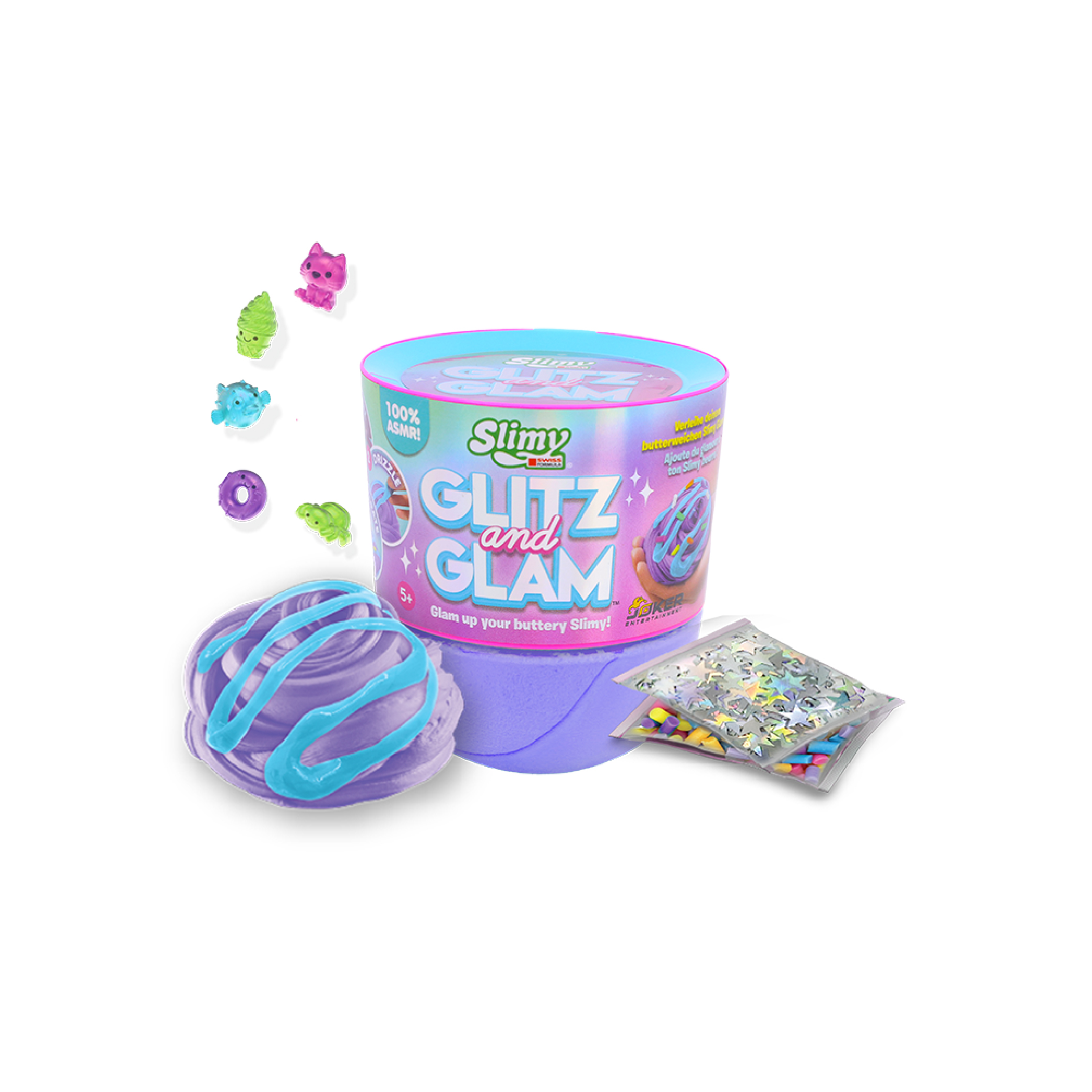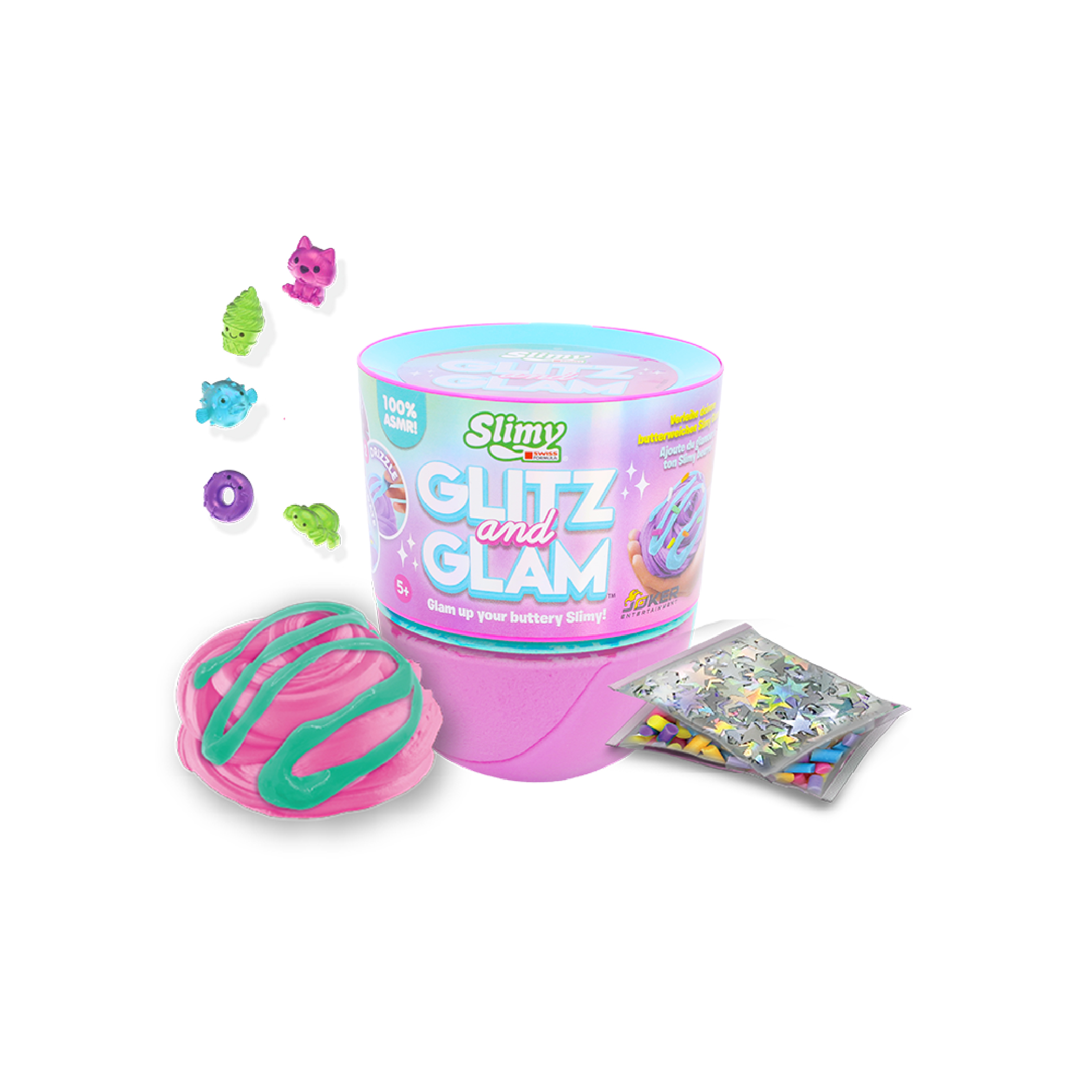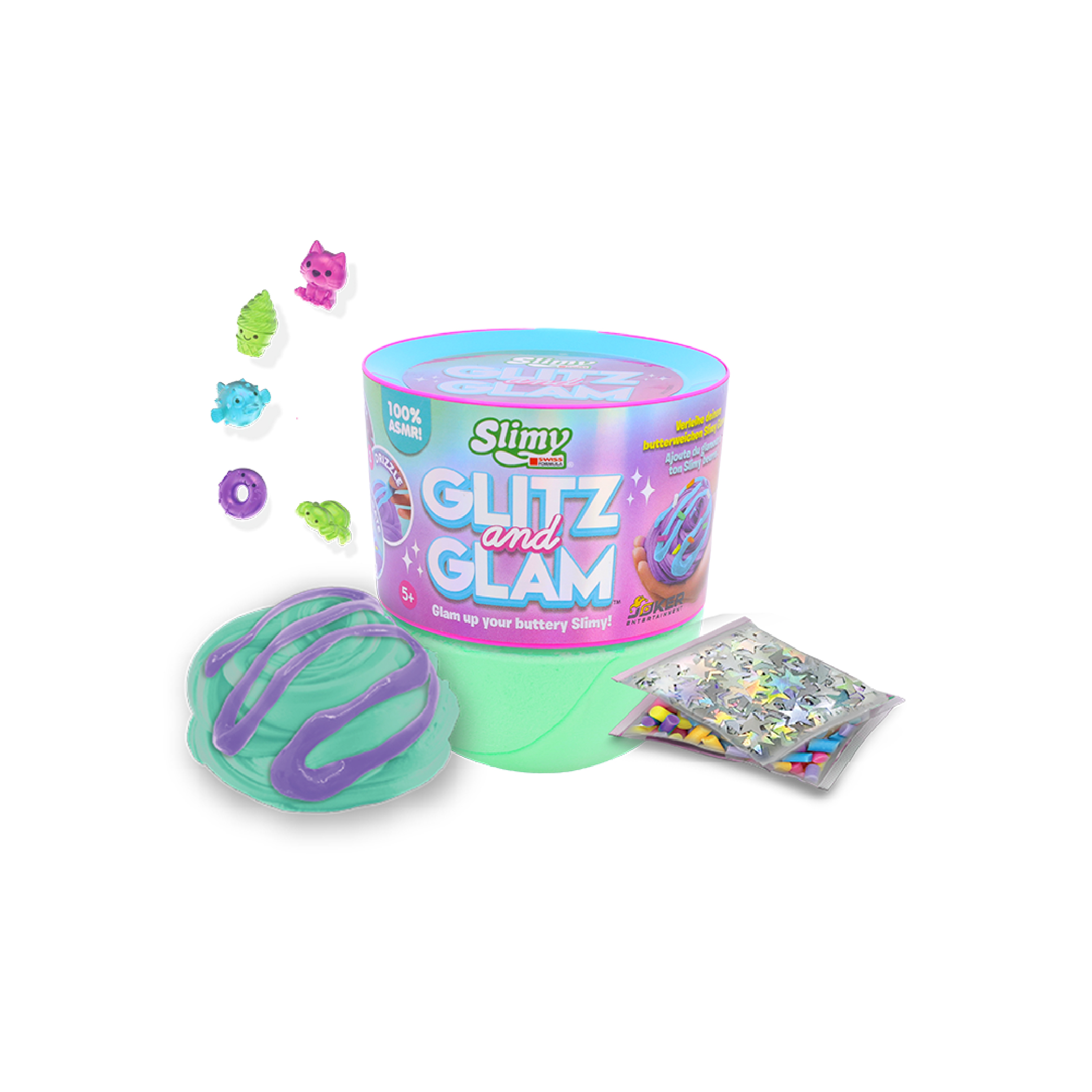 SLIMY GLITZ AND GLAM W DOME TOPPER PDQ by Slimy is a sparkly slime collection featuring a dome topper lid filled with decorative mix-ins, allowing kids to create their own glamorous slime designs.