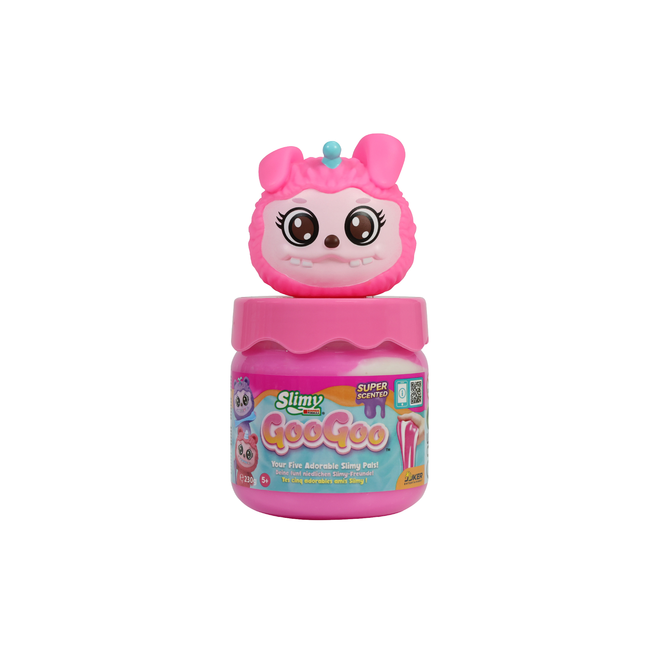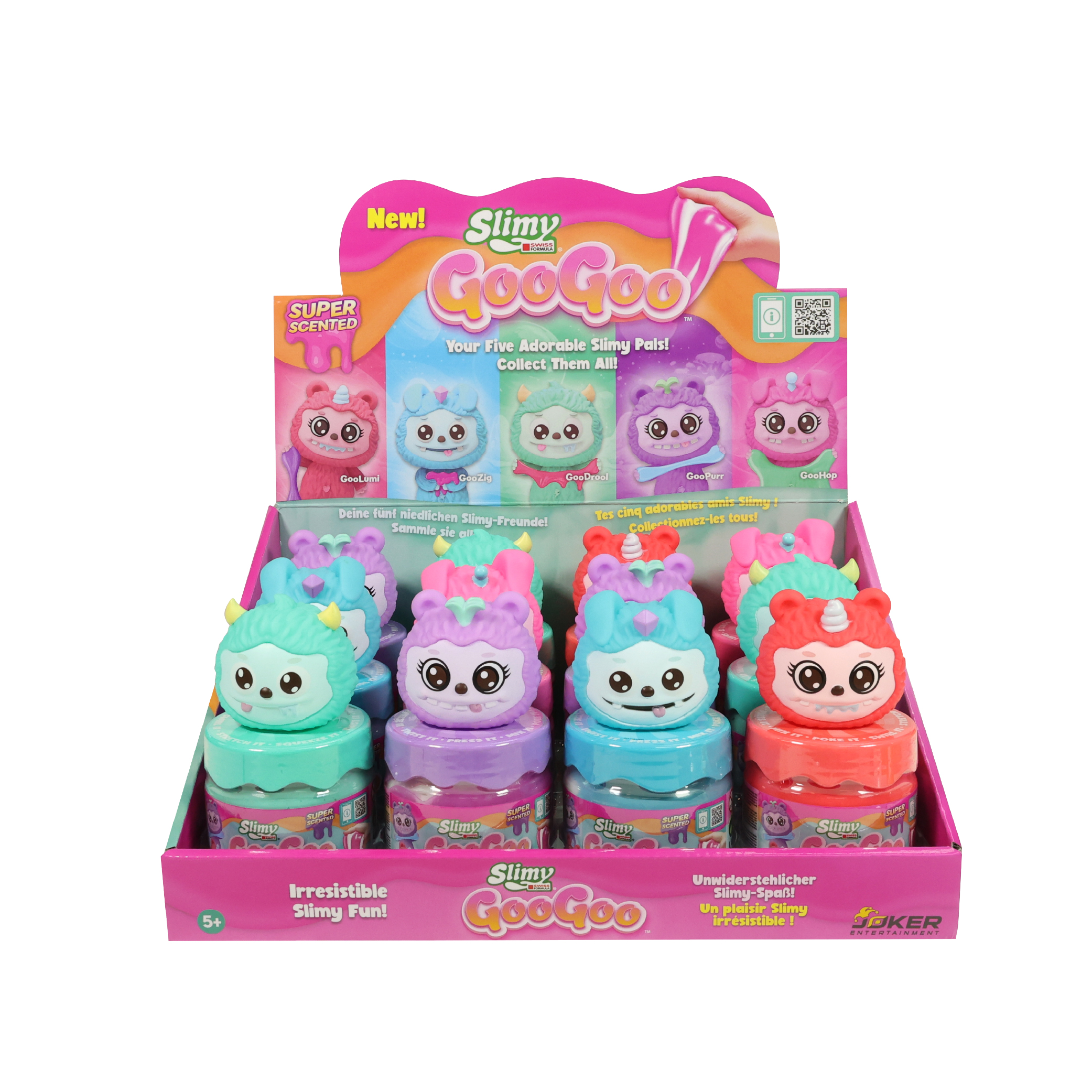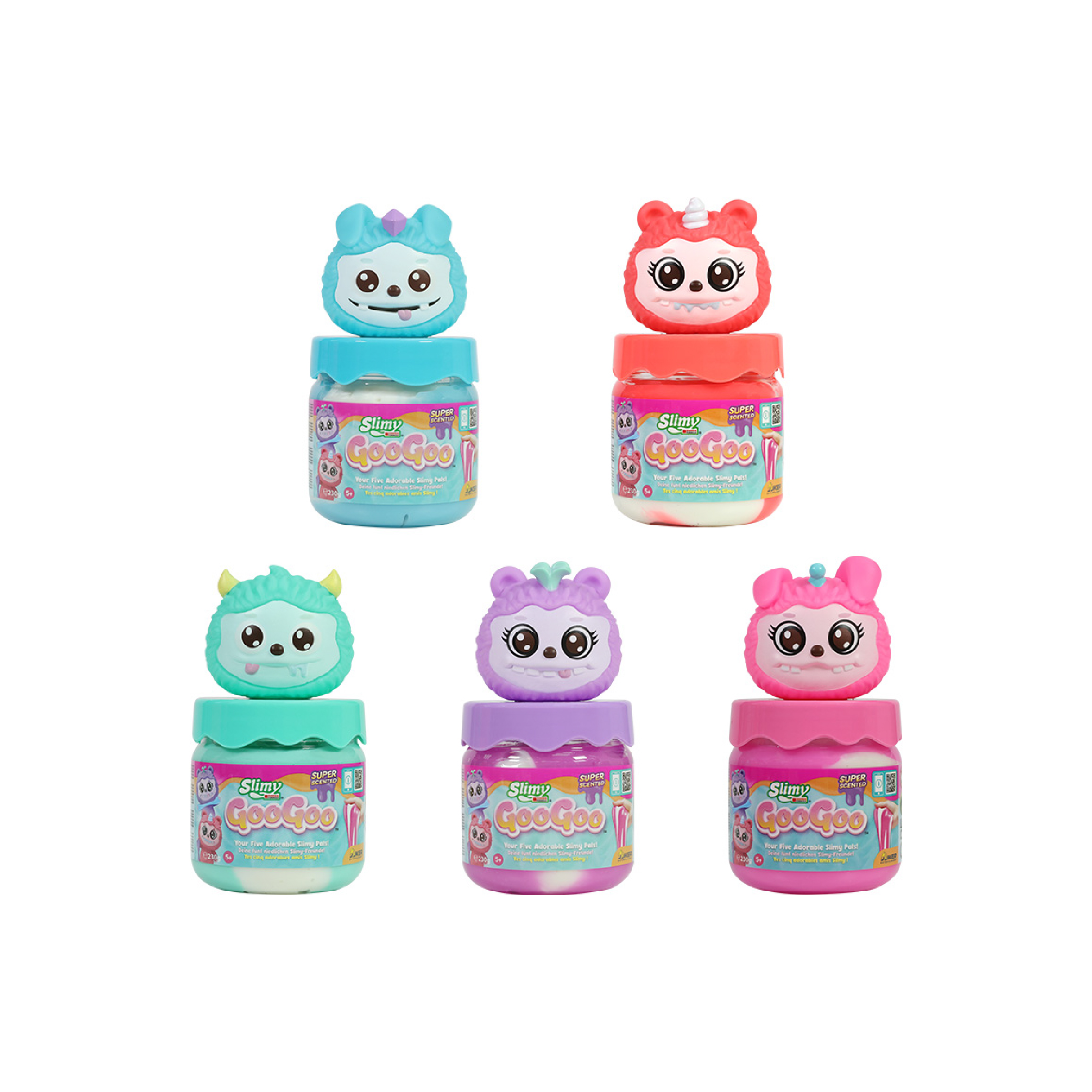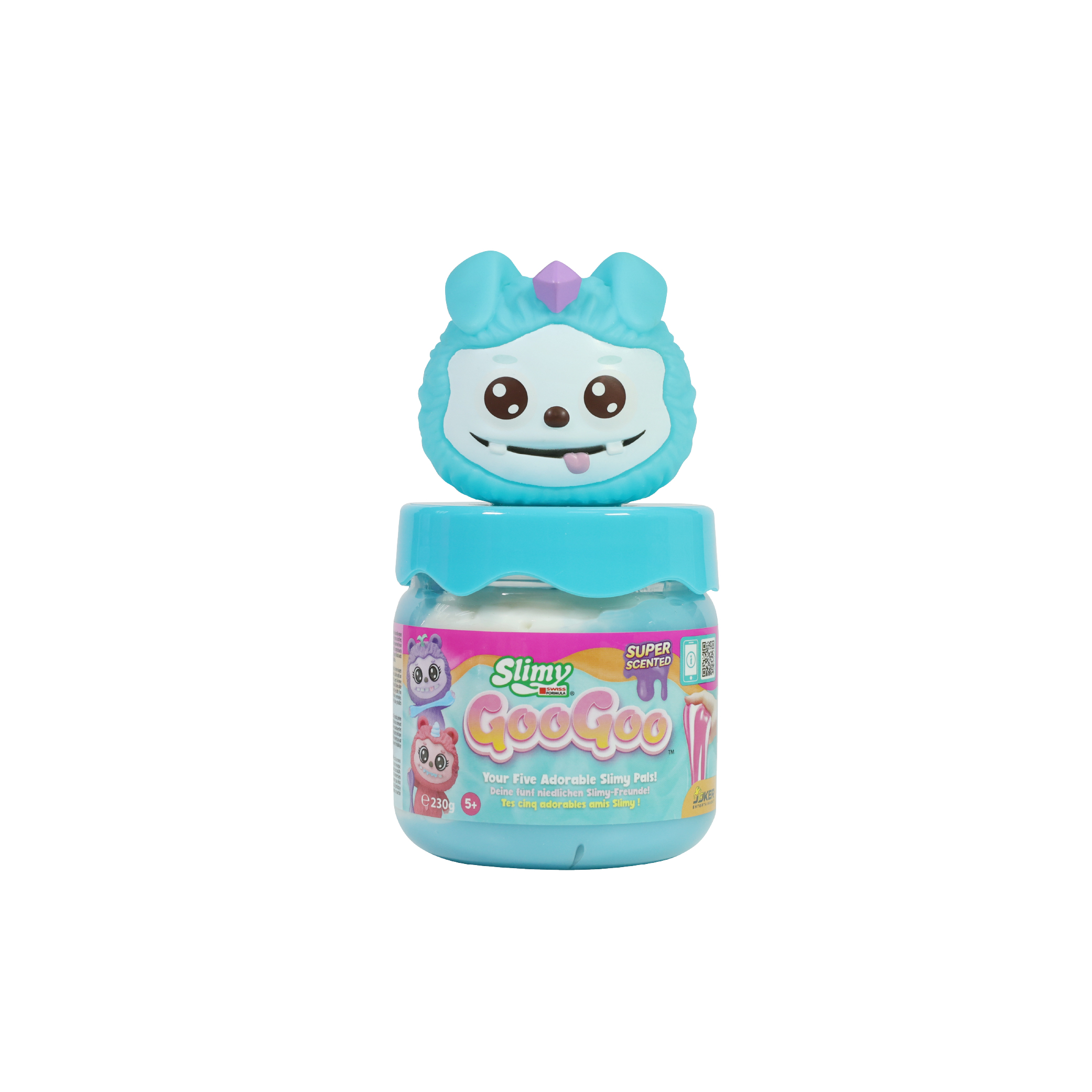 ในถ้วยขนาด 8 ออนซ์แบบใช้ซ้ำได้แต่ละใบ อัดแน่นไปด้วยสไลม์สูตรสวิสสุดพรีเมียม และเพื่อนตัวน้อยแสนน่ารักแบบสุ่ม 1 ตัว จากทั้งหมด 5 คาแรคเตอร์: GooLumi, GooZig, GooDrool, GooPurr หรือ GooHop