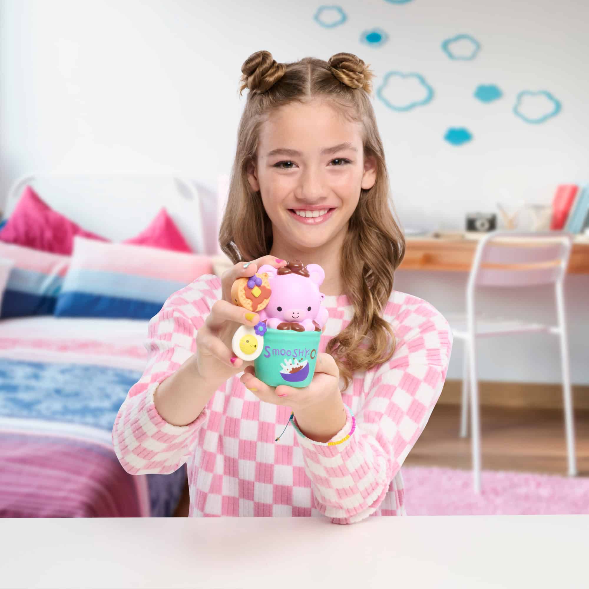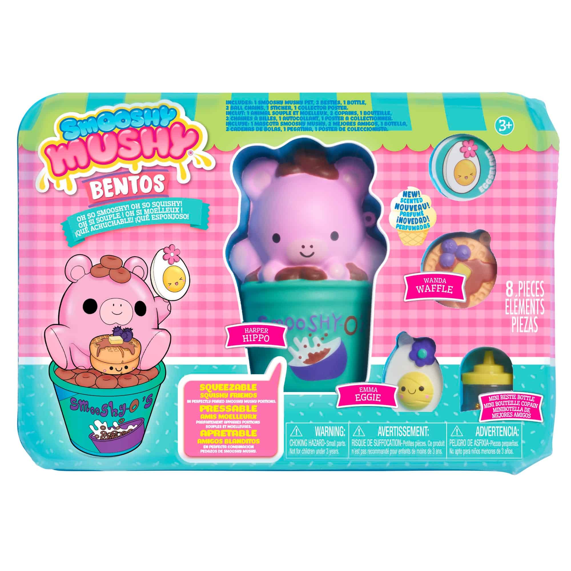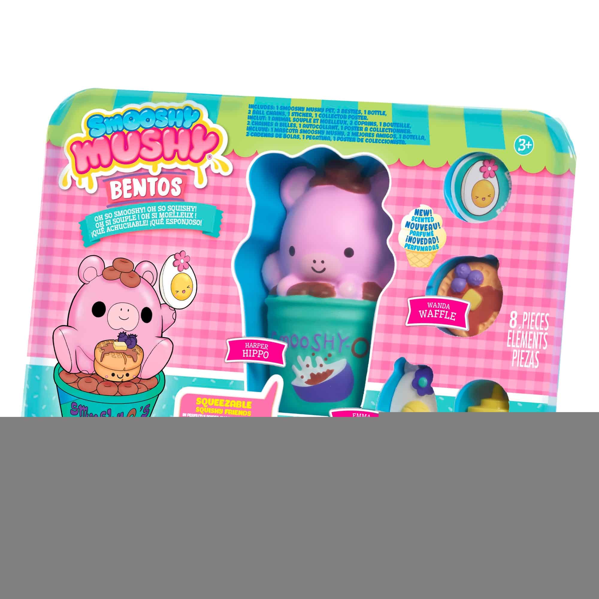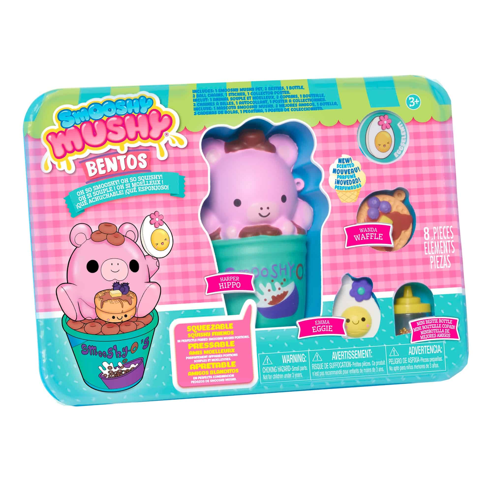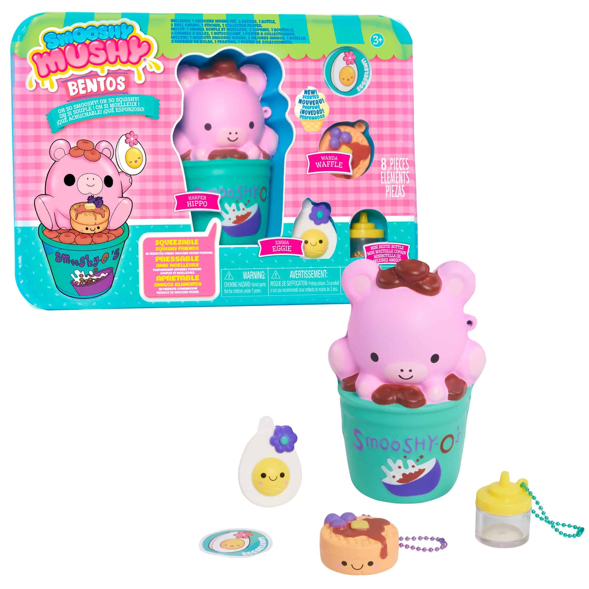 Find a squeezable, squishy friend – and lots of cool accessories with the Smooshy Mushy Bento Box Harper Hippo set. This fantastic breakfast food-inspired sensory toy comes with an exclusive scented 4.5-inch-tall Harper Hippo character in a bowl of cereal, Wanda Waffle and Emma Eggie besties, a mini play drink bottle, a sticker, a collectible poster with bonus activity, and 2 ball chains. Store and display foam characters on the included bento box tray, or thread ball chains through the molded holes on figures to hang on bags, zippers, and backpacks. Harper and besties are made of irresistibly squishable slow foam. Kids will love to squeeze, squish, and watch these fun sensory kids’ toys return to their original shape. For maximum fun, collect all the Smooshy Mushy Bento Boxes to share, play with, and display (each sold separately). These imaginative fidget toys make birthday or holiday gifts, party favors, and anytime surprises for kids ages 6 years and up.