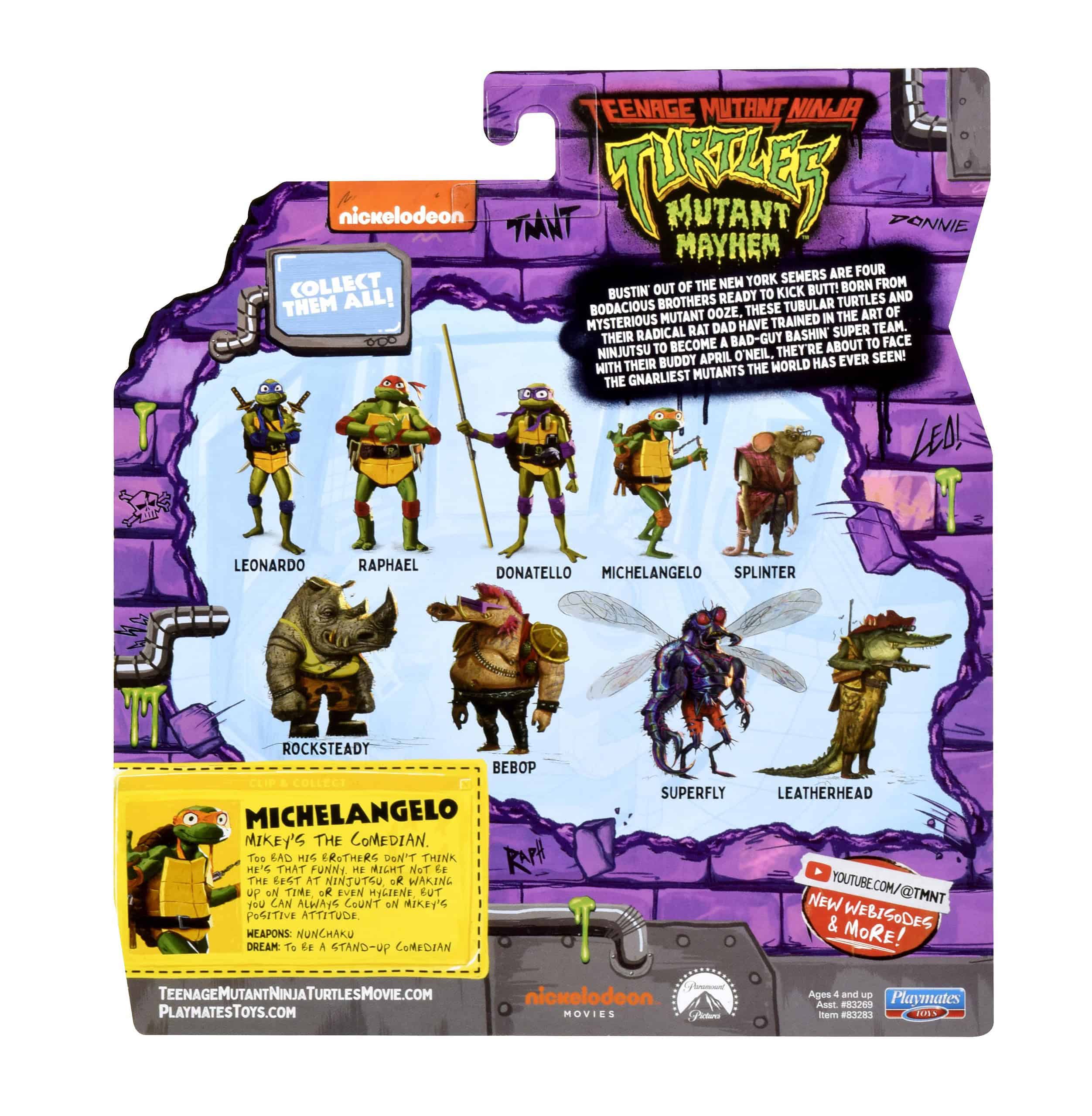 Get ready for the Mutant Mayhem figures and accessories, based on the new CG animated Teenage Mutant Ninja Turtles movie! Tap…tap… “Is this thing on?” Mikey’s the funny one of the group or at least he thinks so! (Sometimes his brothers are a tough crowd.) With some training from his rat-dad Splinter, Michelangelo and his brothers are finally ready to venture into the big city, where Mikey can test out his material. Nothing will come between him and his dream to be a stand-up comedian, even if the only positive feedback he’s getting is from the microphone! •Michelangelo figure is 4.25” tall and designed to match his movie character. Set includes his iconic nunchaku and comes in a unique Mutant Mayhem package!