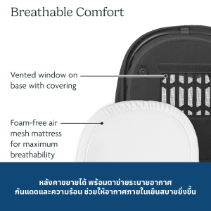 ที่นอนหายใจสะดวกเพื่อการนอนที่ปลอดภัย: ที่นอนทำจากตาข่ายระบายอากาศ (Air Mesh) ที่ปลอดโฟม ให้การระบายอากาศสูงสุด และปลอดภัยสำหรับการใช้เป็นที่นอนค้างคืน (Overnight Sleep Solution)