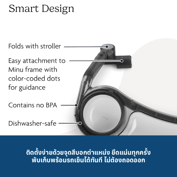 ติดตั้งง่ายดาย: ถาดวางขนมนี้สามารถติดตั้งเข้ากับรถเข็น Minu V3 ได้อย่างง่ายดายด้วยจุดสี (Color-coded dots) ที่ช่วยให้คุณติดตั้งได้ถูกต้องและแน่นหนาในทุกครั้ง