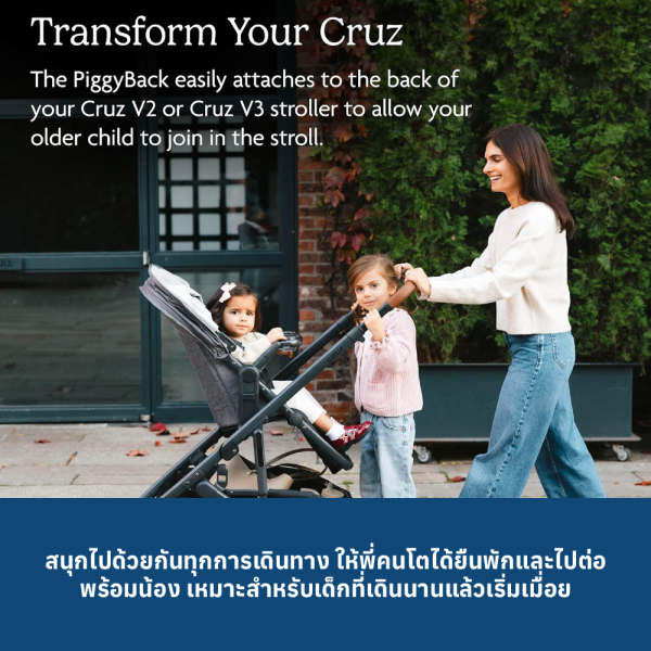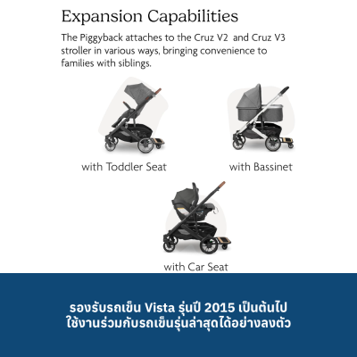 ให้พี่คนโตได้ร่วมเดินทางไปกับน้องได้อย่างสนุกสนาน! PiggyBack คือบอร์ดเสริมที่ติดตั้งเข้ากับด้านหลังรถเข็น VISTA ได้อย่างง่ายดาย เหมาะสำหรับเด็กที่เหนื่อยเกินกว่าจะเดินไหว ให้พวกเขายืนพักและไปต่อได้พร้อมกัน