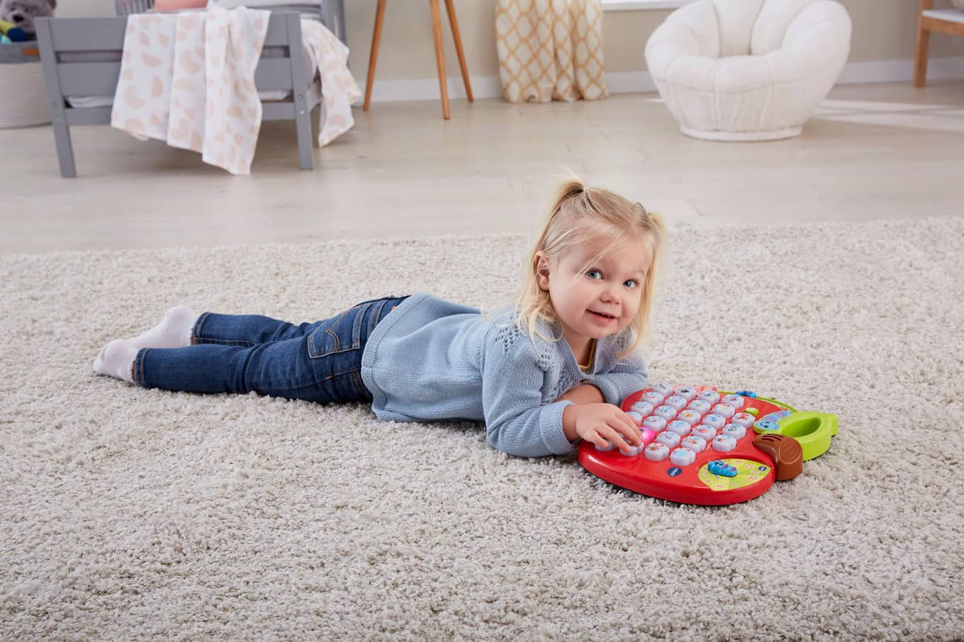 • Explore 26 light-up letter buttons that say the letter names and sounds and an object starting with that letter; switch modes to hear 26 melodies and sound effects