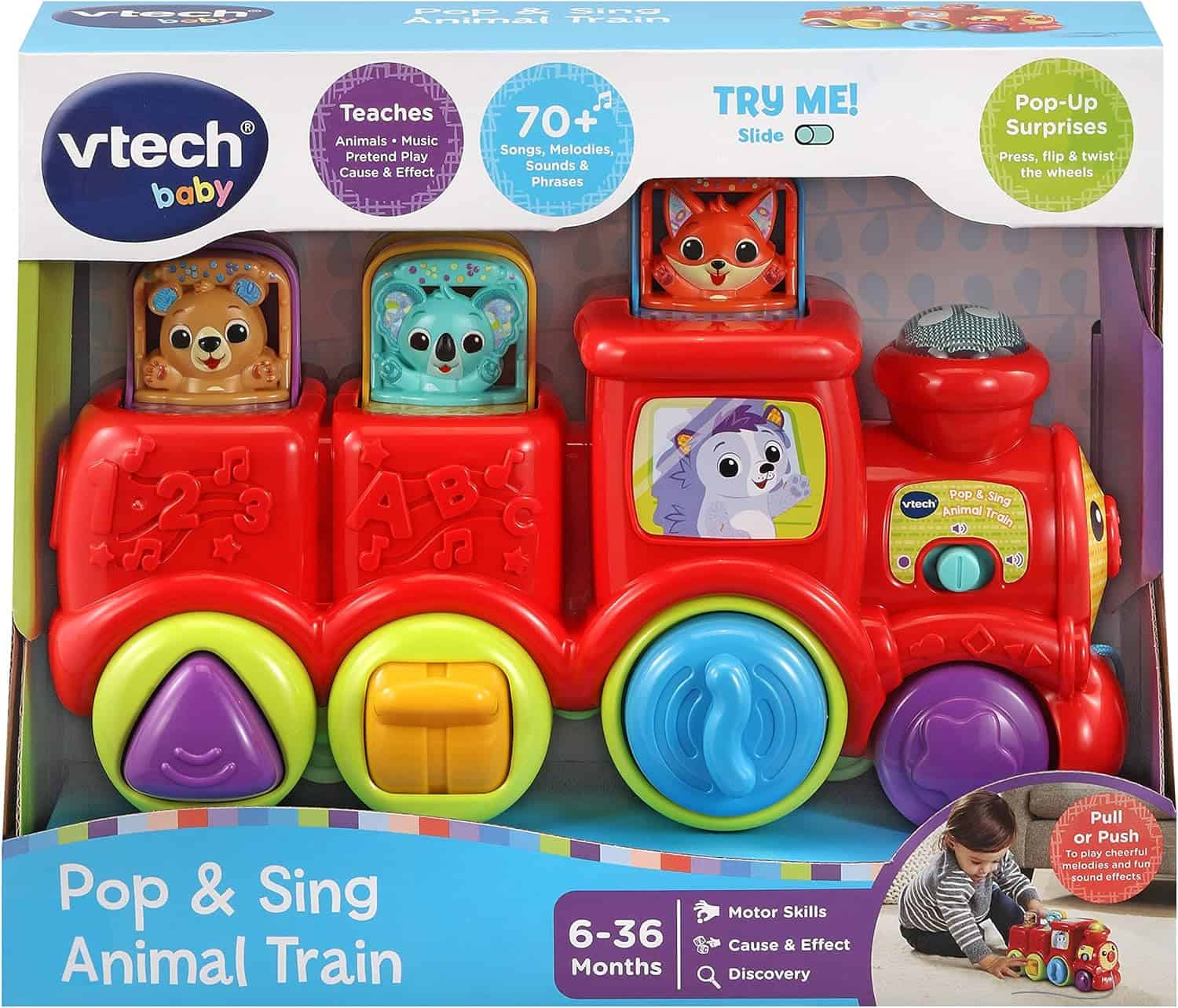 POP UP SURPRISES: Press, push, flip and twist the wheel switches on this train toy to make 3 cute peek-a-boo animals pop up, rewarding curiosity, encouraging play, developing fine motor skills and demonstrating cause and effect! Each pop will trigger the animals to introduce themselves with fun phrases and extra presses with trigger more interaction and learning excitement!