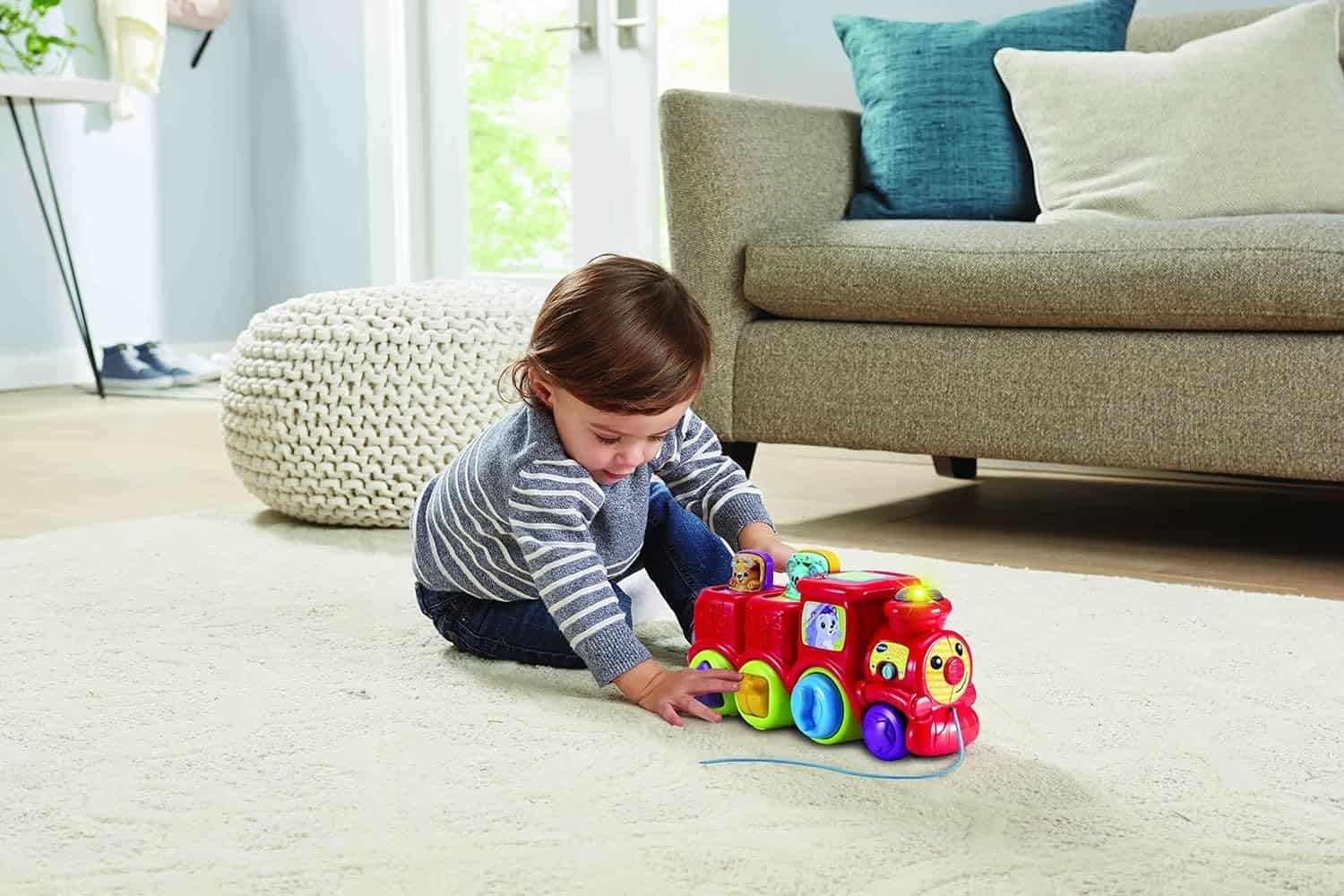 PUSH OR PULL: This train toy features a motion sensor, which when pushed or pulled will play fun train sounds and melodies, accompanied by flashing lights from the chimney! Perfect for developing motor skills. Easily switch from a push to a pull toy by removing the pull cord from the storage bay under the train!
