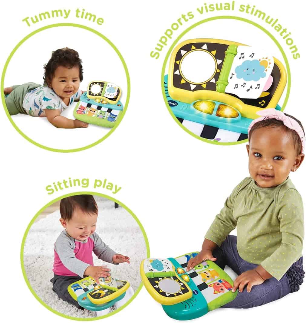 TUMMY TIME PIANO: Little ones will love this soft fabric piano which introduces animal characters and triggers fun sounds and melodies!VISUAL STIMULATION: Supports visual stimulations with bright colours, patterns, flashing lightsand a discovery mirror whilst allowing tummy time and sitting play.INTERACTIVE TOY: Baby will develop fine motor skills by turning the high contrast page to hear sing-along songs, melodies and phrases.BABY MUSICAL TOY: Features 7 sing-along songs and 22 melodies, so your baby will never get bored!IDEAL GIFT FOR BABIES: This fun pre school toy for boys and girls is perfect as a present for your baby’s first Christmas or birthday. Watch your little one develop as they learn and play along with all the features.
