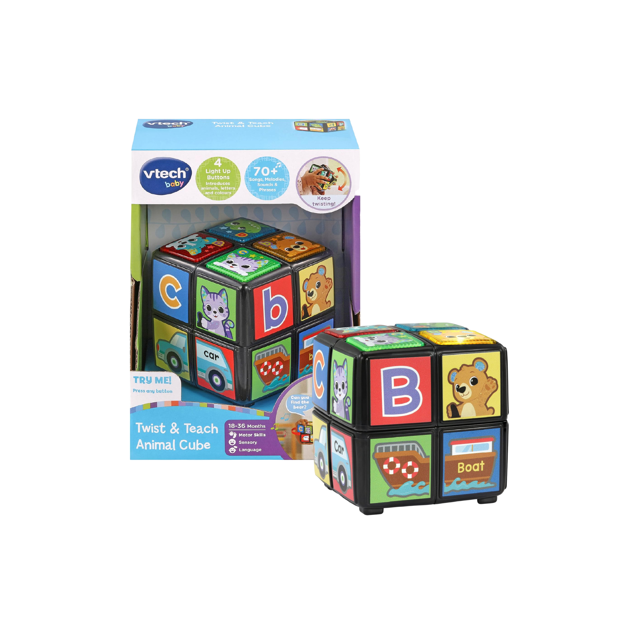 Light-Up Buttons: Features four light-up buttons on top of the cube that encourage baby to interact and discover. Press them to learn animal names, letters (phonics), and colours.