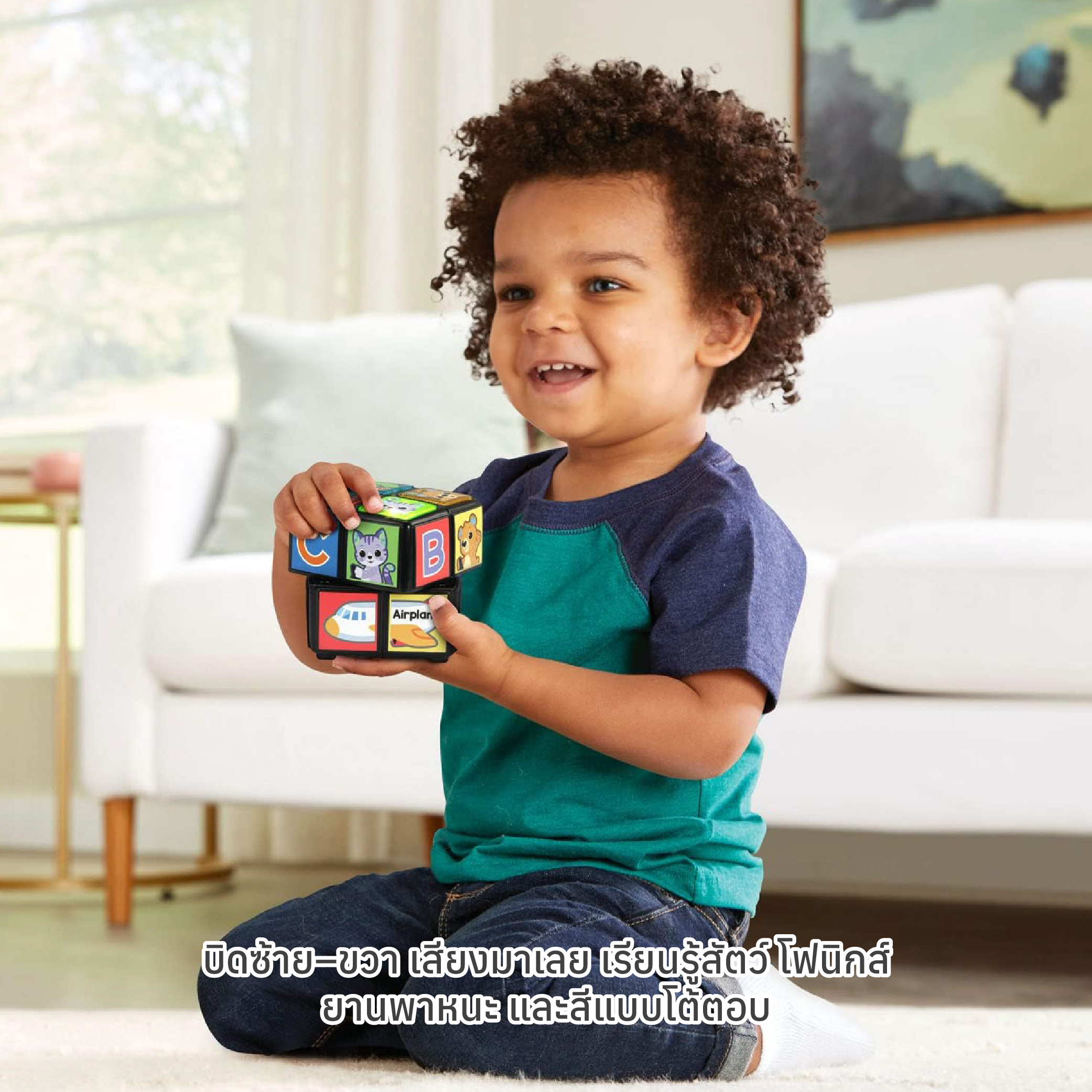 การเรียนรู้แบบโต้ตอบ: บิดลูกบาศก์ไปทางซ้ายหรือขวาเพื่อกระตุ้นวลีการเรียนรู้ที่สนุกสนาน พร้อมกับการแนะนำเรื่องสัตว์ การออกเสียง (Phonics) ยานพาหนะ และสี