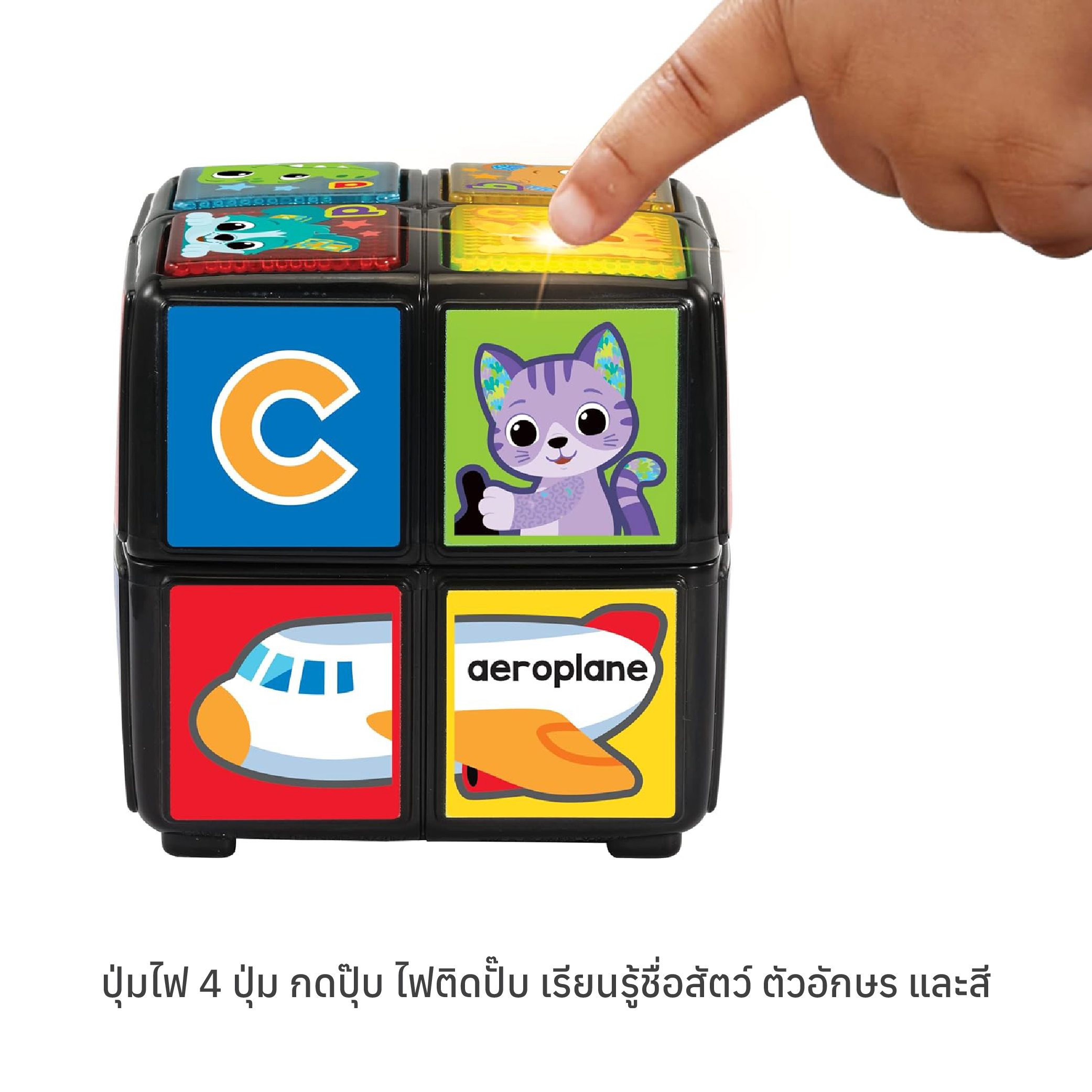 ปุ่มมีไฟ: มีปุ่มไฟสี่ปุ่มอยู่ด้านบนของลูกบาศก์ที่กระตุ้นให้เด็กโต้ตอบและค้นพบ กดปุ่มเหล่านี้เพื่อเรียนรู้ชื่อสัตว์ ตัวอักษร และสี